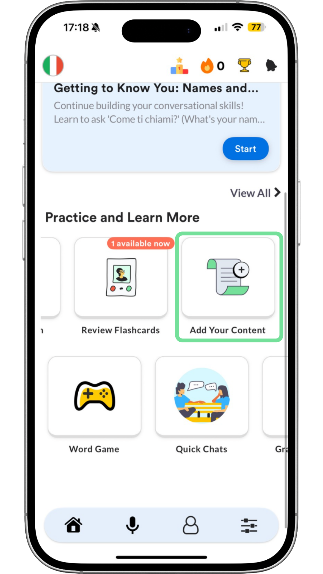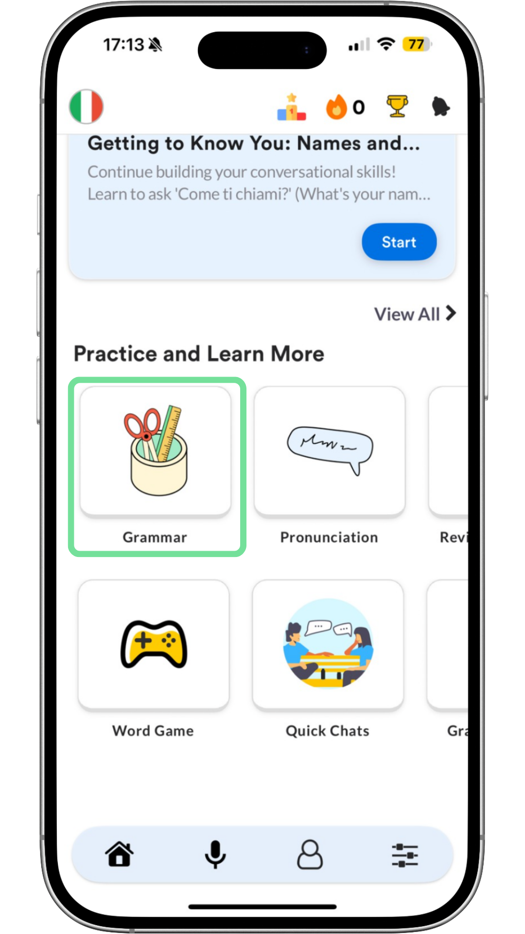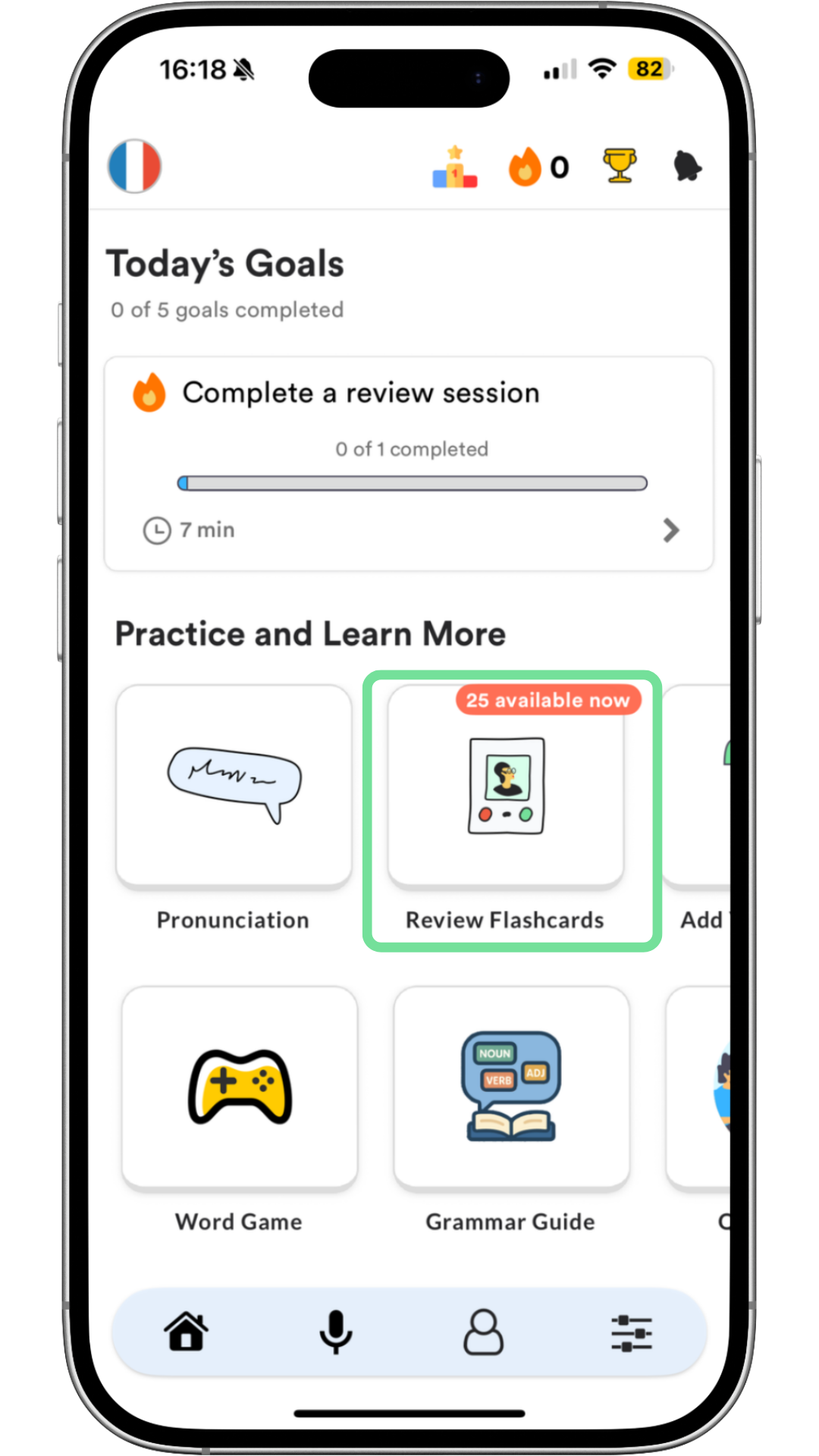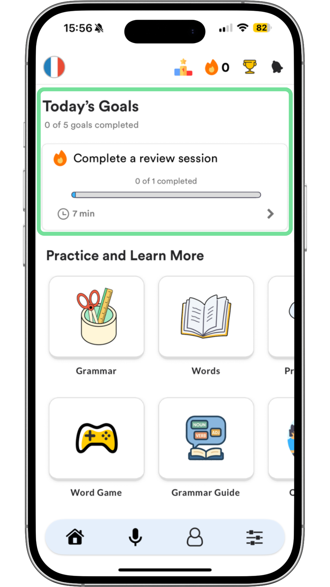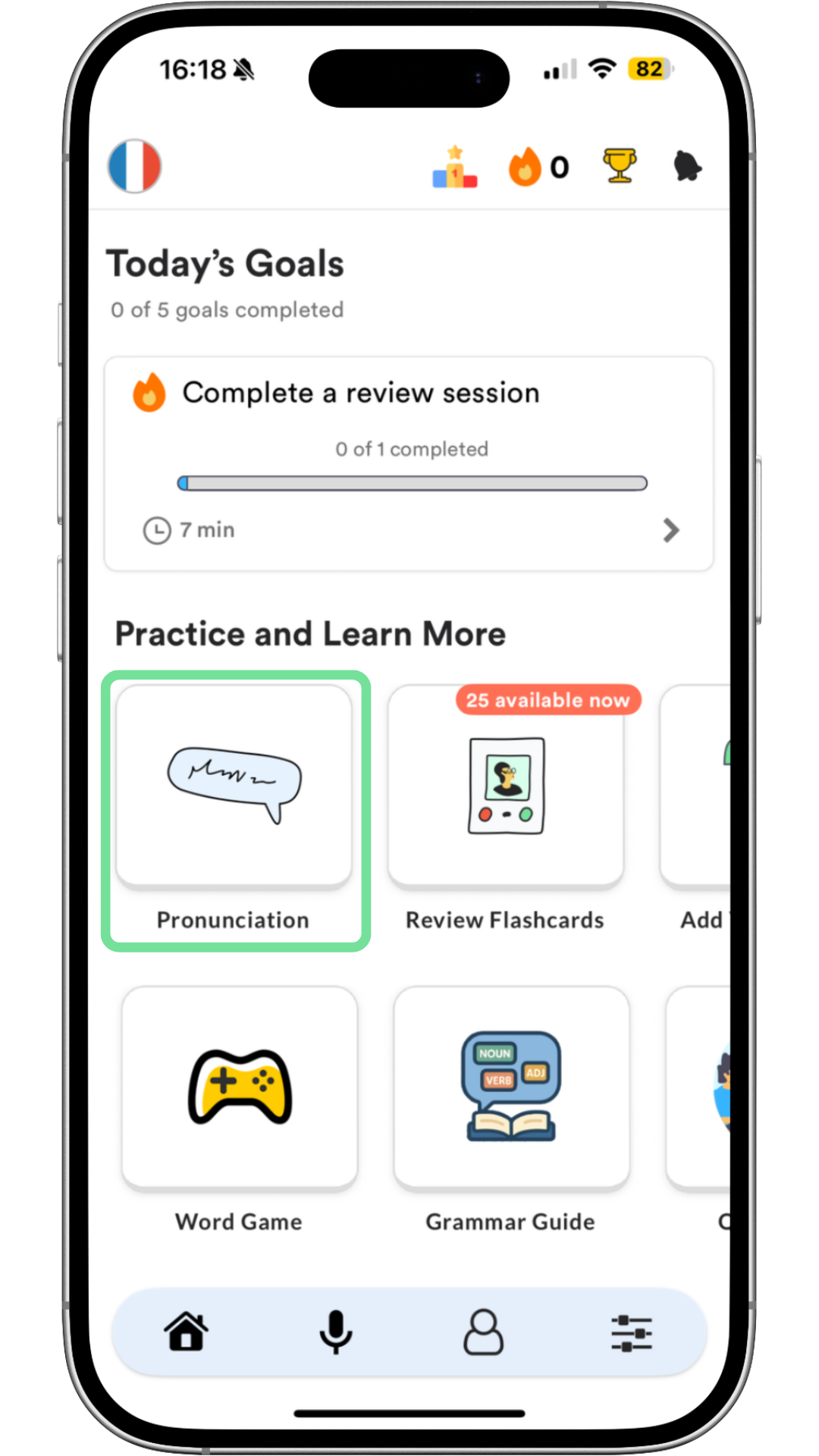 When you first log in, you’ll answer a few questions about your level and your comfort with pronunciation. From there, you'll see various different tiles on your Home screen, but for now, we'll focus on the key ones.