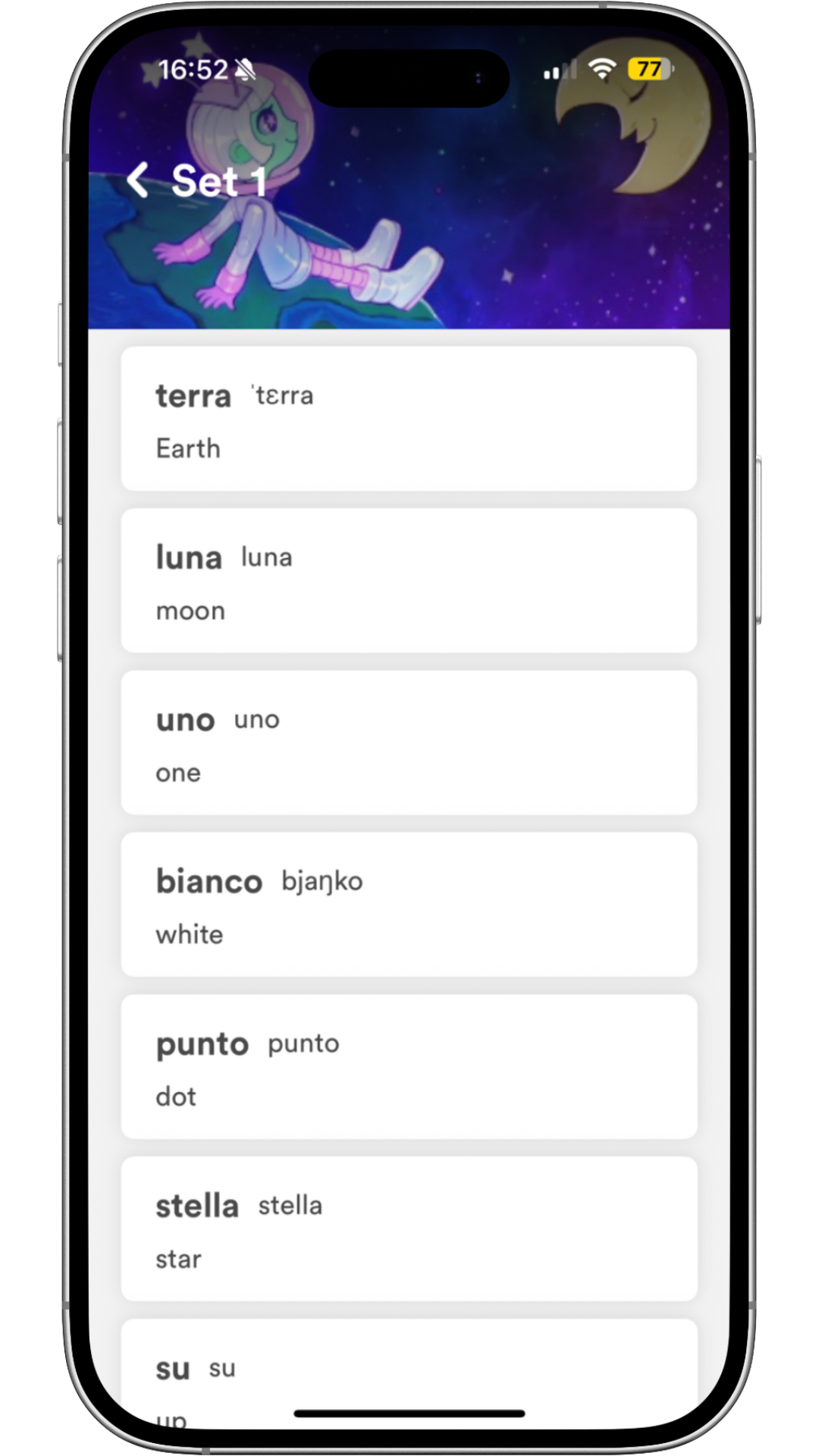 Each set contains multiple words. There are 89 sets in total, and they’re linked to Grammar sets — so when you finish the words in Set 1, the related Grammar set will be disappear too.